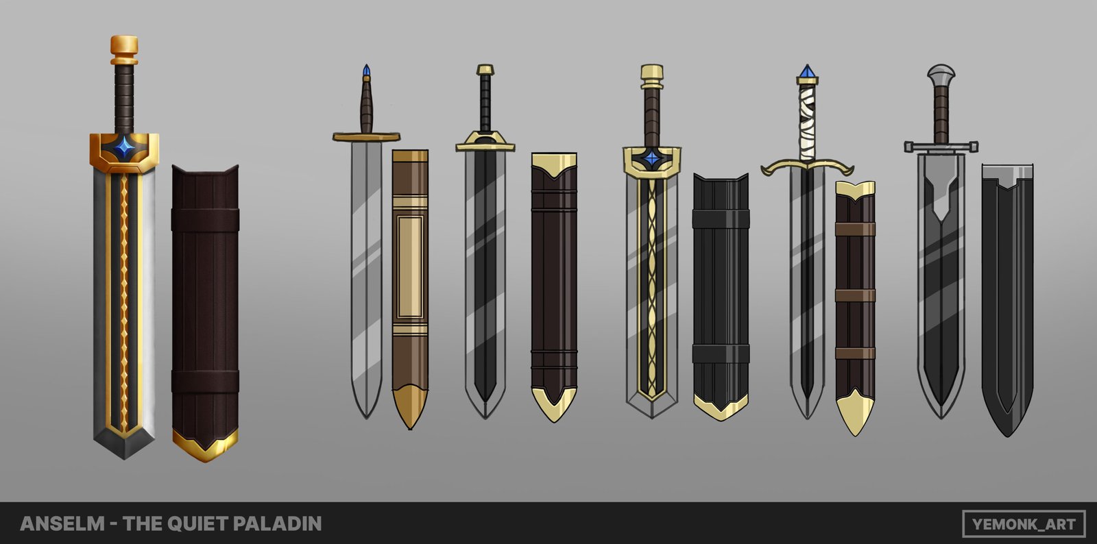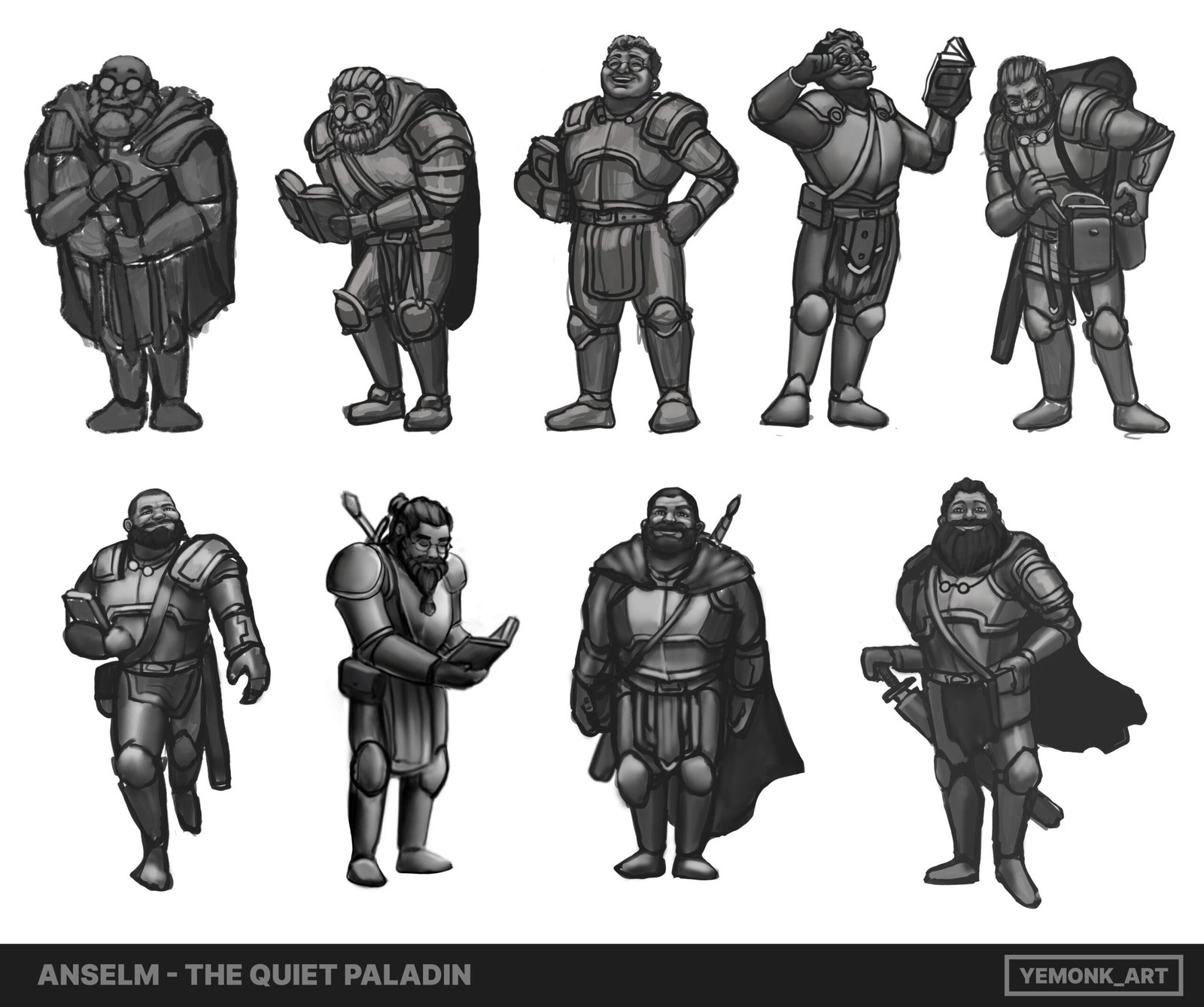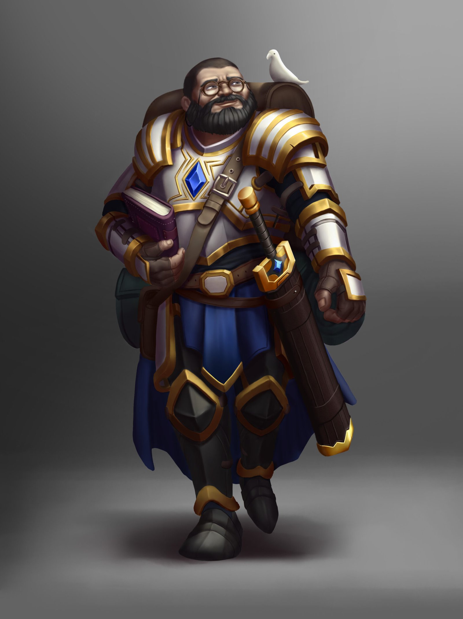 Exploring the contrast between heavy armor and scholarly elements, allowing posture, props, and celestial color accents to guide the character’s final identity.