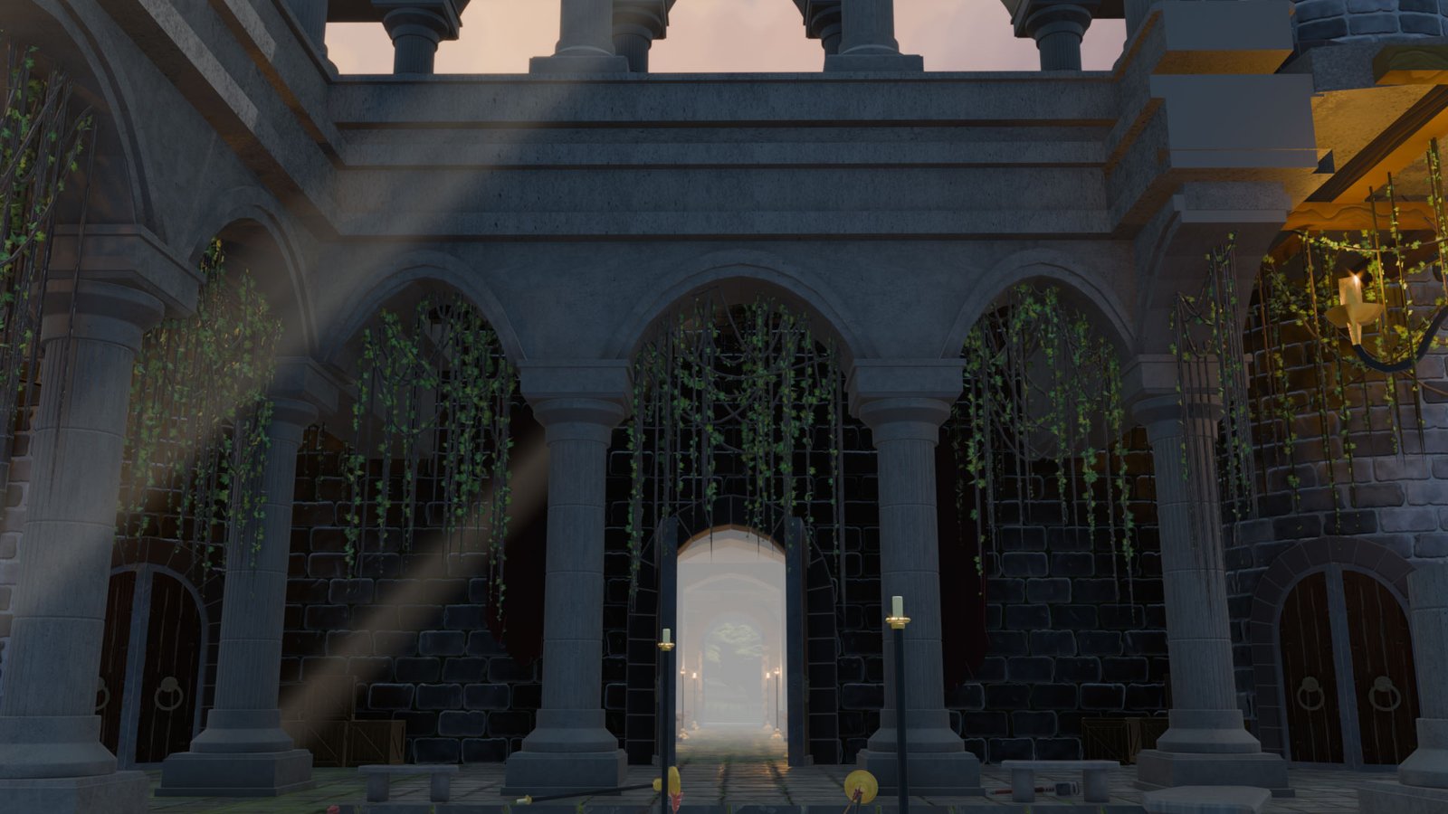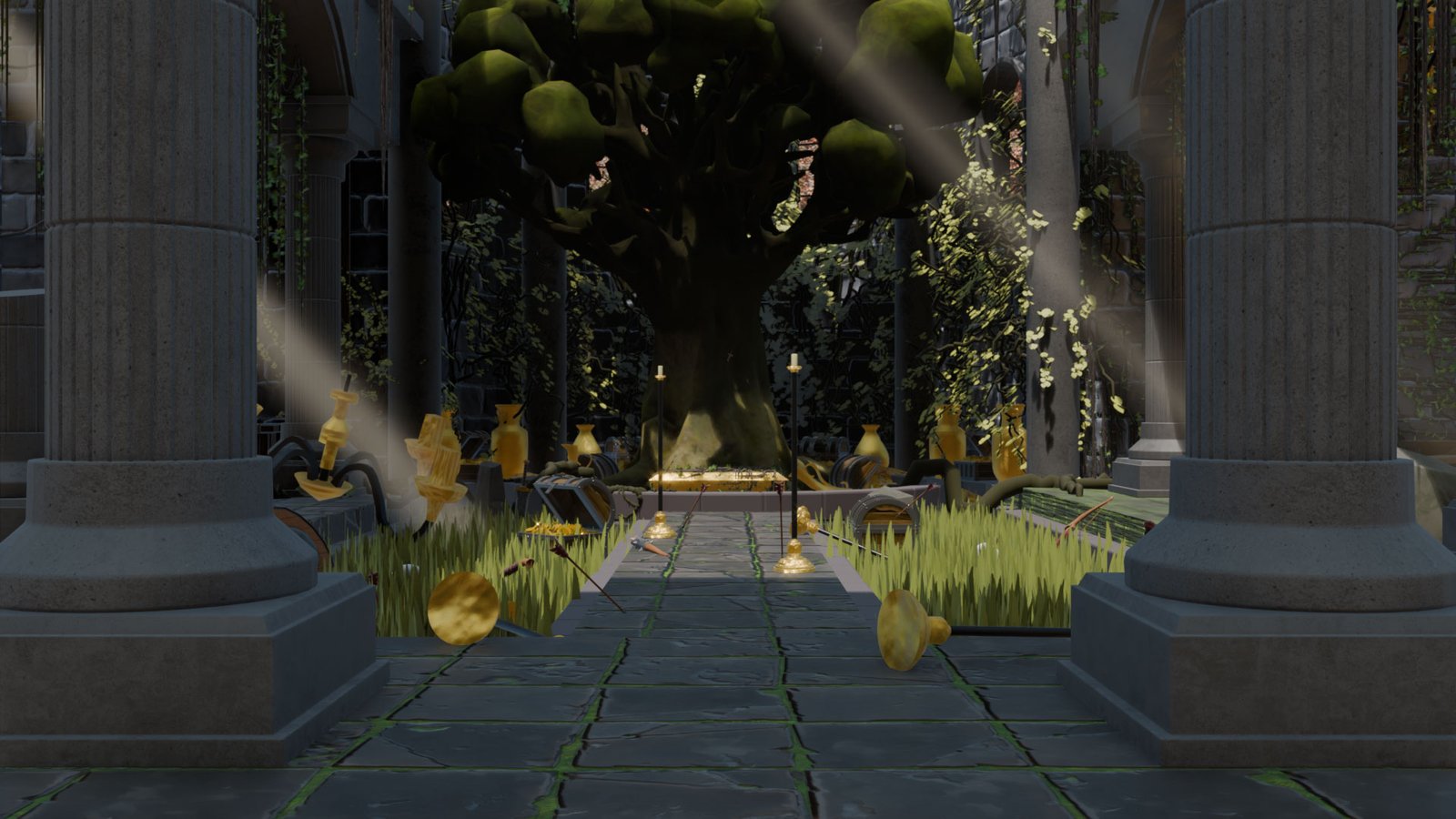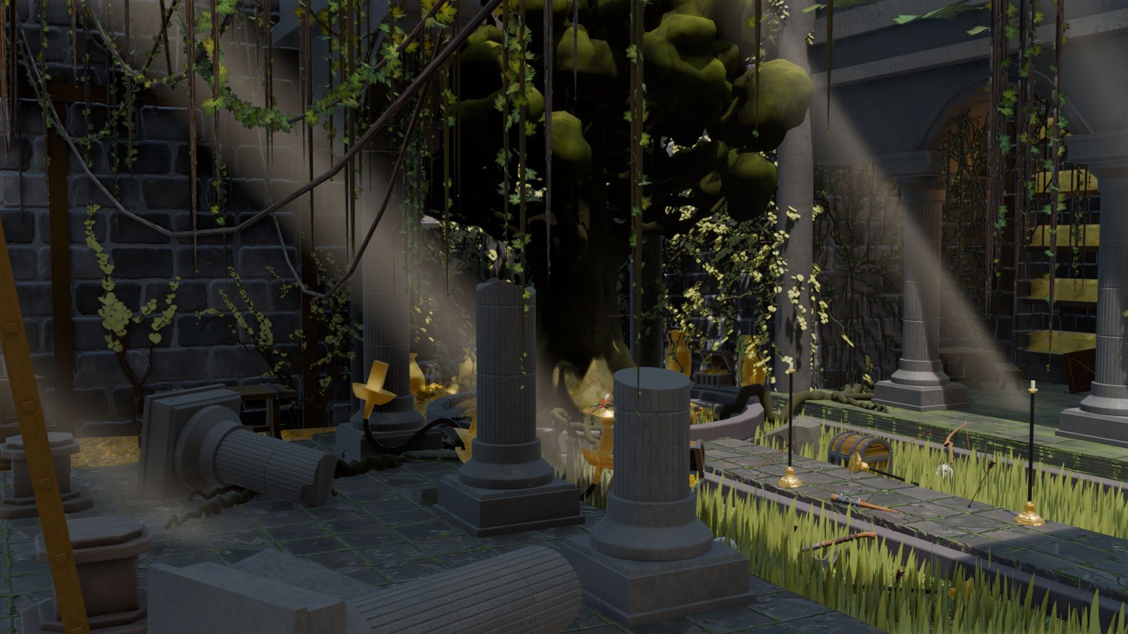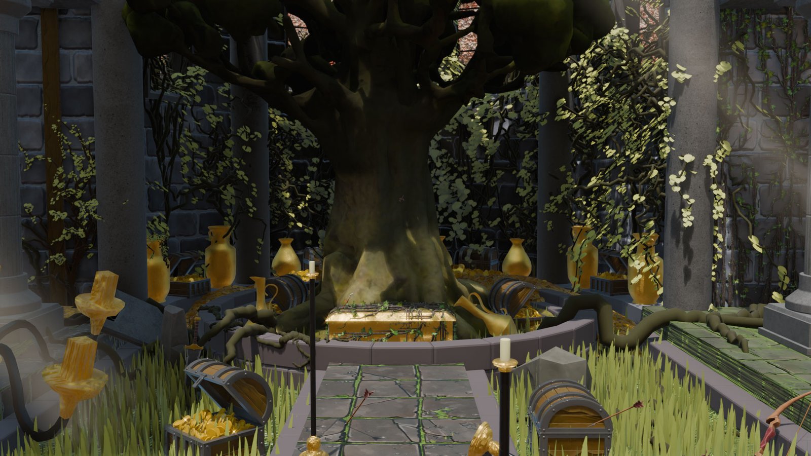 The main focus was to practice environment creation in Blender, from modeling to scene composition, while working with stylized PBR textures sourced from free resources. Special attention was given to mood, material definition, and the balance between natural overgrowth and stone structures to support the narrative atmosphere of the location.