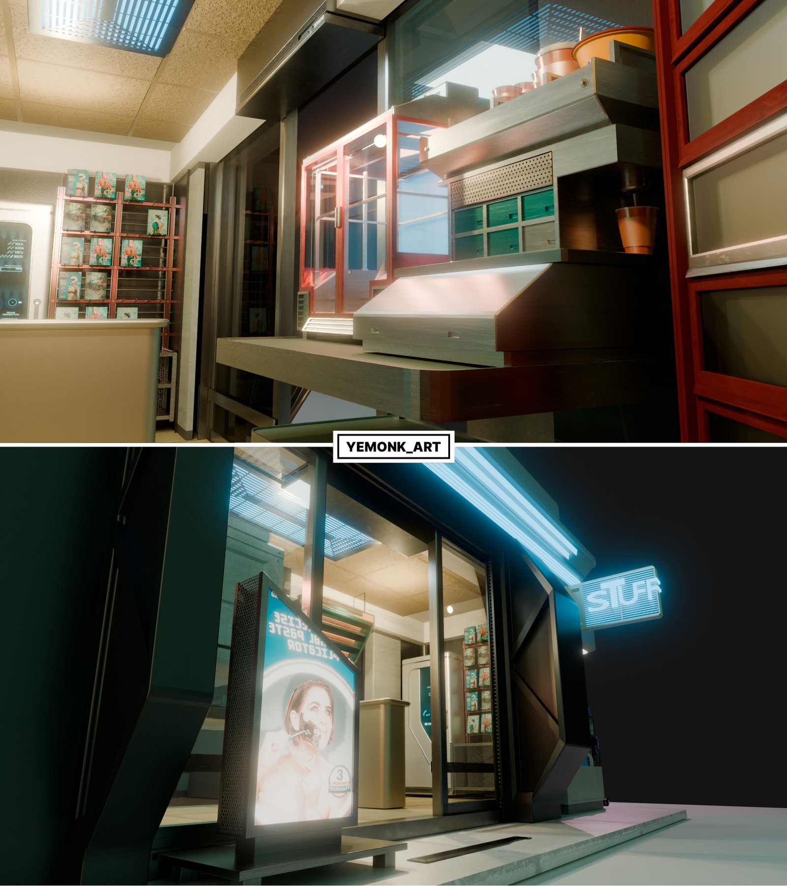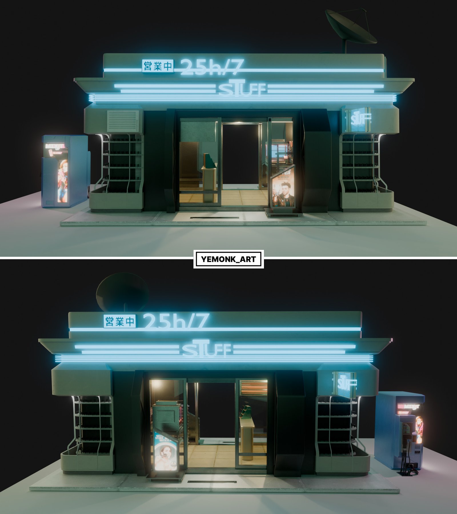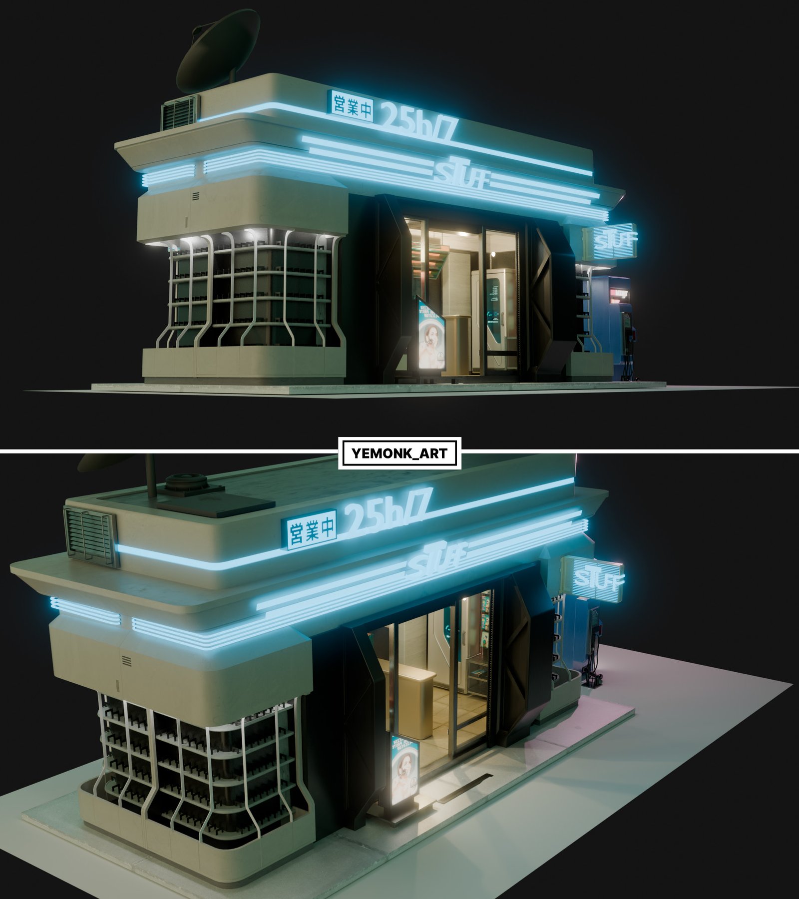 This is a 3D study based on the “25h/7” store from the Cyberpunk 2077 universe, recreating a structure commonly found throughout Night City. The project was developed as a personal learning exercise to explore and strengthen my skills in Blender and 3D visualization.