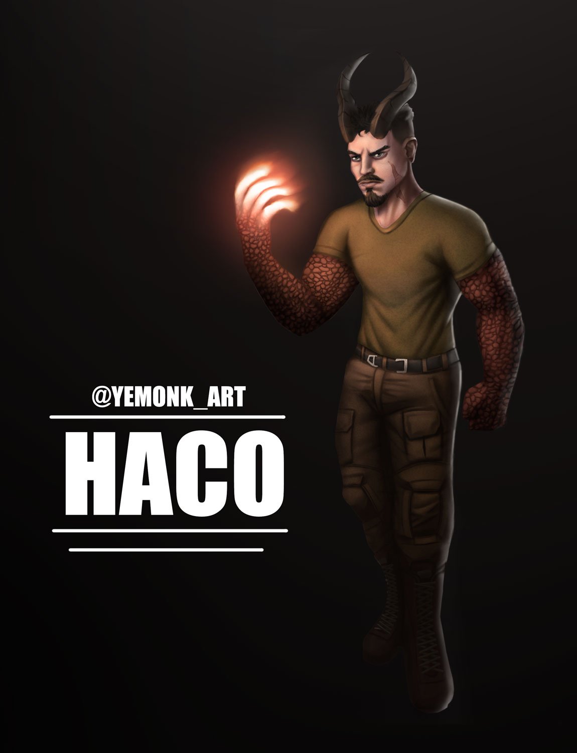 Haco is a half-dragon soldier aligned with the ruling powers of his world, embodying the disciplined and imposing nature of the oppressive regime in contrast to revolutionary forces like Elnar’s. His draconic origin traces back to a near-fatal battle in a distant land, where he discovered a mythical dragon who offered him its power in exchange for sharing its consciousness. This bond saved his life, but also infused him with a conquering mindset driven by the dragon’s hidden intentions—ultimately allowing Haco to rise through the ranks of the army. As a result, he can channel controlled dragon flames through his hands, reflecting both his power and his divided nature.