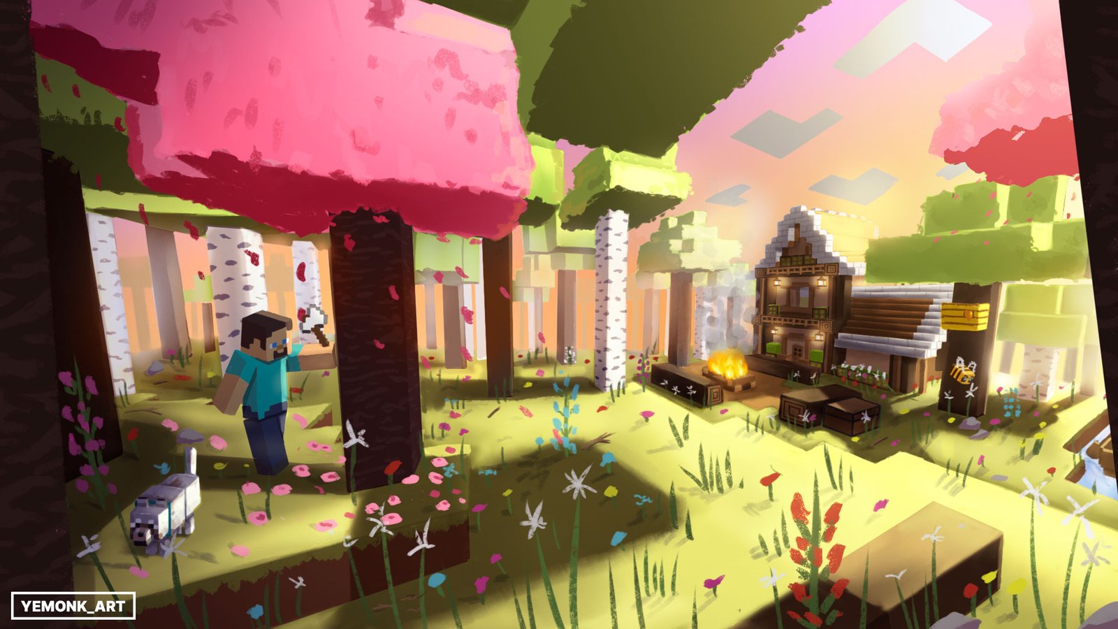 This is a commissioned illustration created for a Fiverr client, depicting a Minecraft-inspired landscape at sunset. The scene explores the contrast between the intense warm light of the setting sun and the deep shadows cast across the terrain, creating a calm, contemplative, and nostalgic atmosphere reminiscent of the game.