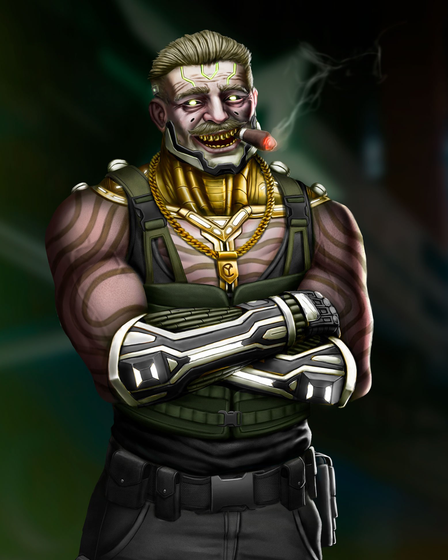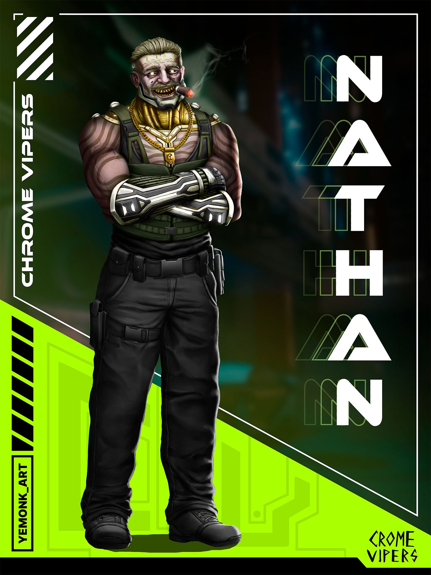 This piece presents Nathan “Specter”, the calculated and imposing leader of the Chrome Vipers, one of the most influential criminal organizations in Cyberpunk City. His presence reflects power, control, and the tense atmosphere of the city’s underworld.